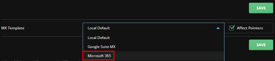 2. Onder het kopje “Set Remote MX Records” vind je een drop-down menu waar je de Microsoft instellingen kan selecteren.